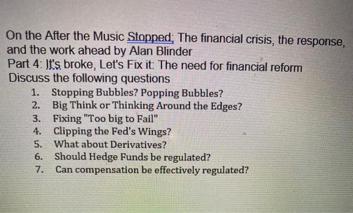 Professor alan blinder talked about his book, after the music stopped: The future of capitalism after the financial crisis: Of course, the music did come to an abrupt stop soon. In after the music stopped, he delivers a masterful narrative of how the worst economic crisis in postwar american history happened, what the government did to fight it, and what we must do to recover from it.